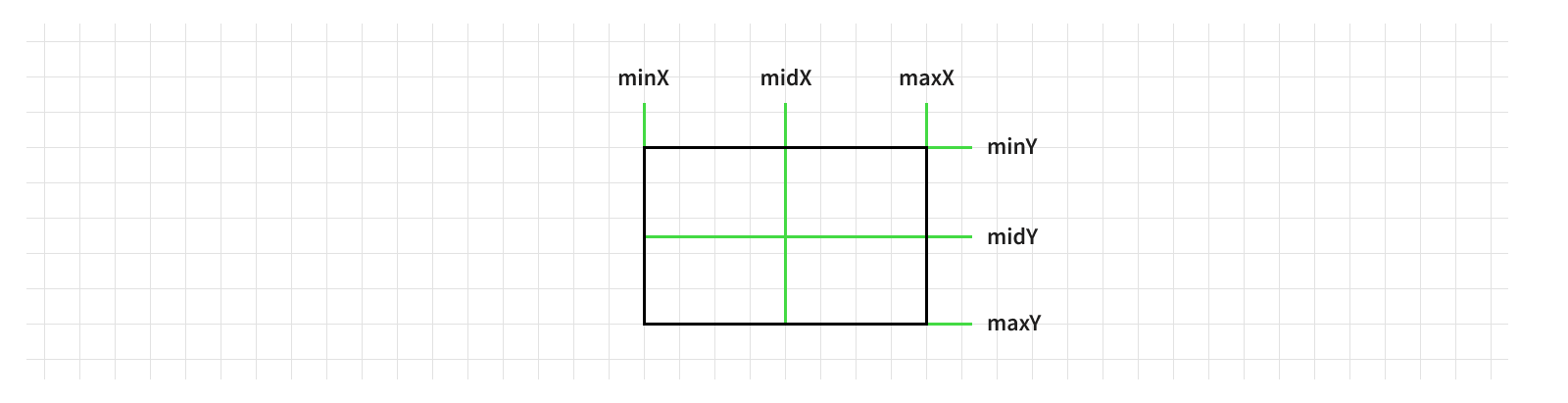 While we could calculate the center point of the superview’s bounds using its origin and size, there is an easier way. CGRect provides conveniences to get the min, mid, and max values for the rect along each axis. These take the form of properties on the rect named minX, midX, and maxX, along with the corresponding *Y equivalents4.